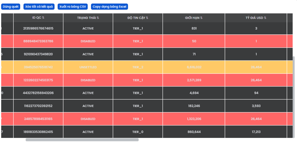 Trạng thái tài khoản: Phân loại rõ ràng Active, Disabled, hoặc Unsettled (Nợ tiền).